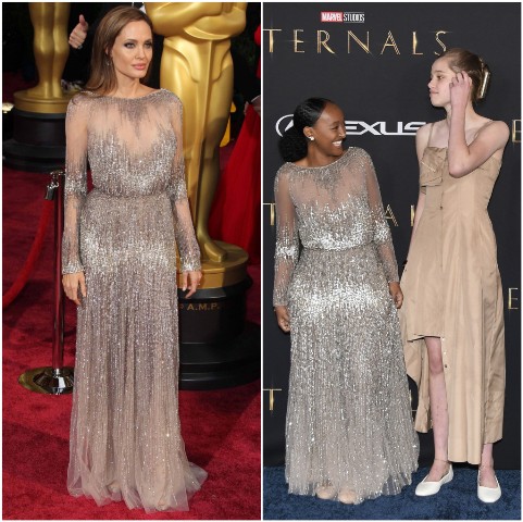 -Моите деца измешаа винтиџ парчиња и ги ставивме старите работи во оптек– изјави Џоли на црвениот килим на премиерата. Захара го облече мајчиниот оскаровки фустан, Медокс носеше црн костум, Вивиен бел фустан, Нокс темен костум со интересен елемент на панталоните, а Шајло избра асиметричен фустан во боја на песок. Некои од овие парчиња се позајмено од плакарот на Анџелина.