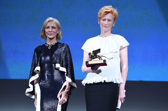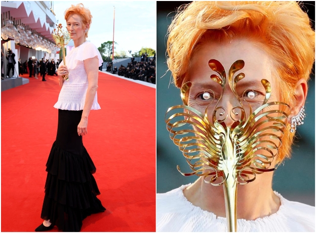 Свинтон се појави во црно-бела креација на Шанел, но вниманието го привлече златната орнаментирана маска. Во Венеција таа го промовира новиот филм на Алмодовар, The Human Voice, а исто така ја прими и наградата за животно дело.