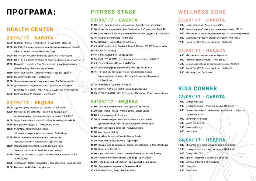 Оваа година, покрај одличната промена на локацијата – на отворено, третото издание на овој исклучителен настан ќе понуди и одлична, најбогата програма до сега, со мнгоу, многу активности (дури над 70!). Она што е ново е што активностите ќе бидат распоредени на четири сцени на кои паралелно ќе се одвиваат активности – Health Center, Fitness Stage, Wellness Zone и Kids Corner, како и еден анимациски дел со натпреварот OBSTACLE COURSE.