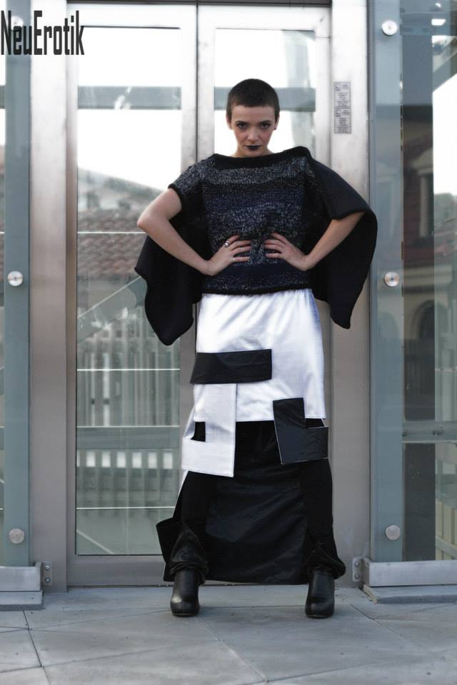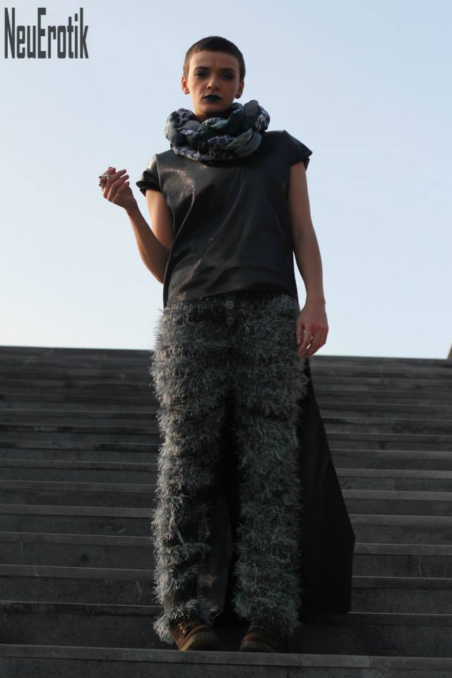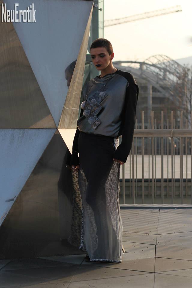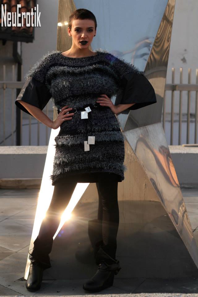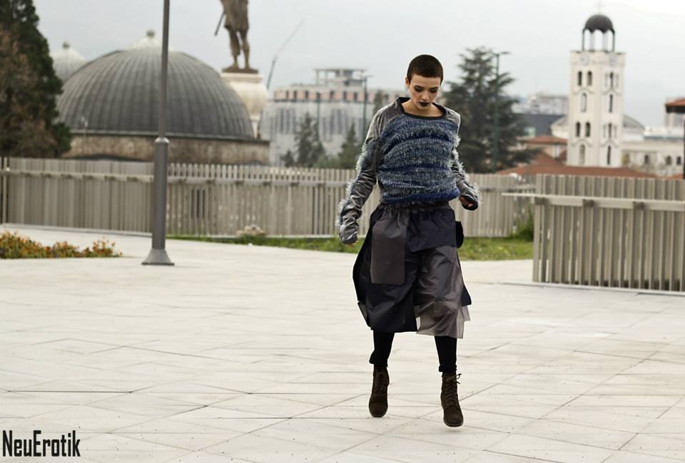 -Индустријалниот карактер на колекцијата е истакнат преку форми на облеката и додатоците. Ги користам едноставни, геометриски и минималистички облици на облеката. Врз нив е „насликан“ шум со горенаведените начини. Се појавуваат минималистички панталони, прави здолништа украсени со интересни детали. Џемперите претежно се во oversize облик. Палтата и блузите се украсени со различни испреплетени форми, но излегуваат од едноставни кројки-вели таа.