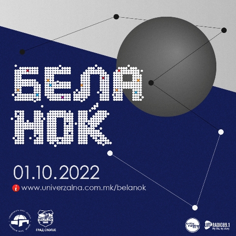 Традиционалната културна манифестација „Бела ноќ“ ќе се одржи во сабота, 1 октомври, на повеќе локации низ Скопје. Скопјани и посетителите ќе имаат можност да уживаат во музички концерти, изложби, проекции, поетски читања, работилници, жонглерско шоу и перформанси на десетици локации низ градот.