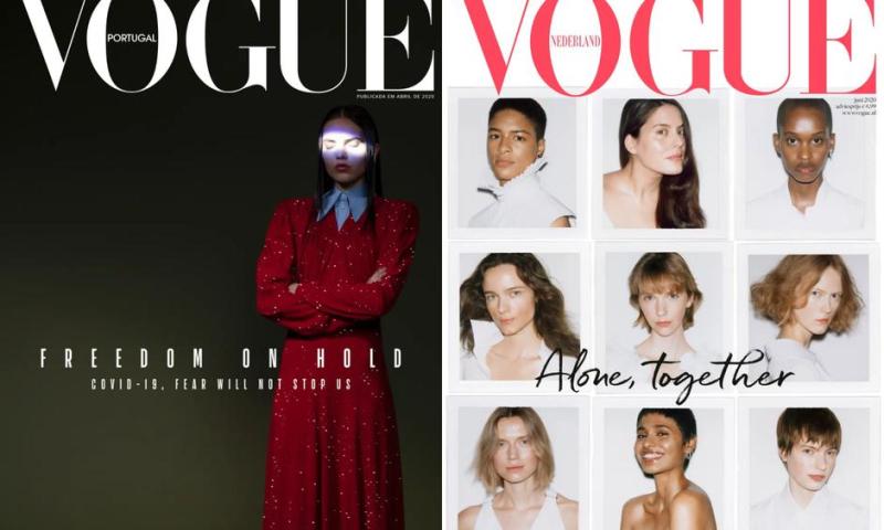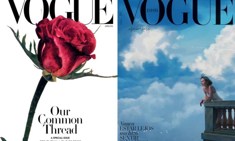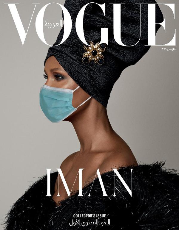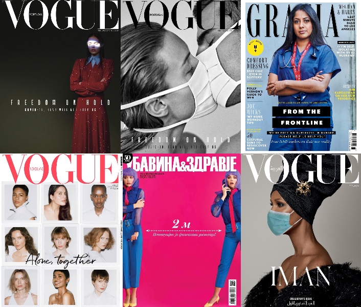 Vogue Italia неодамна претстави бела, празна насловна страница посветена на здравствените работници. Португалското издание е со двојка со заштитни маски како се бакнува и со порака дека стравот нема да нè сопре. Маска носи и Иман на насловната на Vogue Arabia, а темата е важноста на поврзаноста, дури и во време кога сме физички одвоени. Фотографијата на Иман е од архива, а подоцна компјутерски ѝ е додадена заштитна маска. Холандското издание има насловна направени преку видео повик. Американски Vogue во двобројот на јуни и јули на насловната стави една роза која што претставува убавина, надеж и будење.