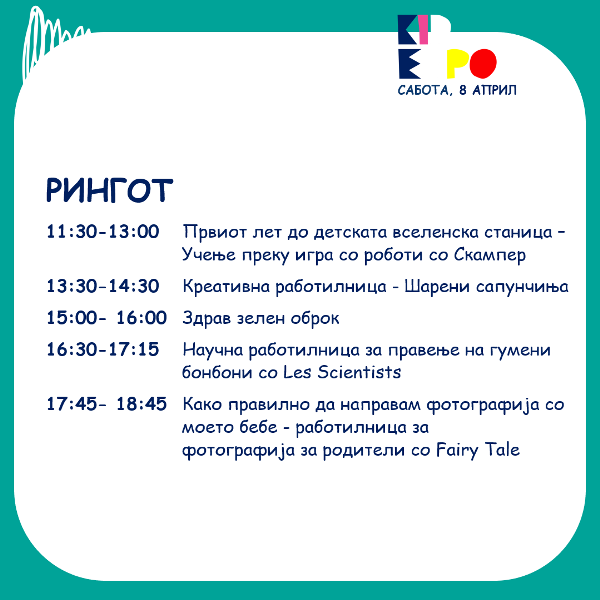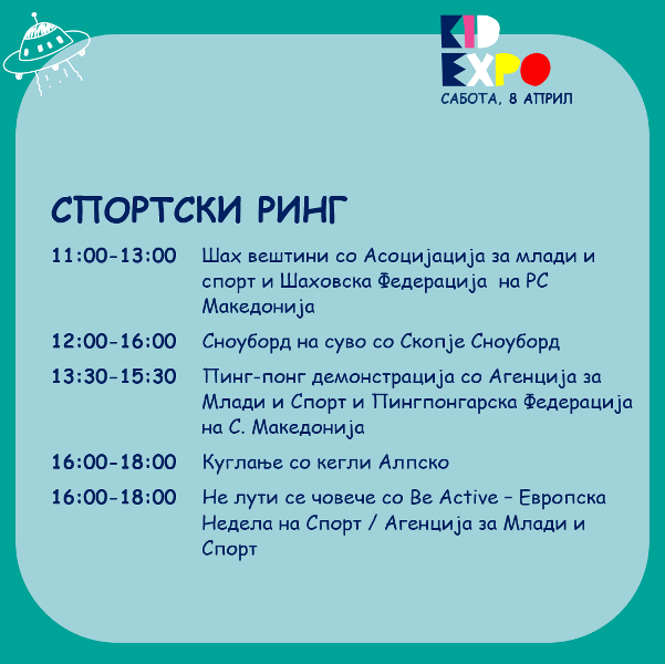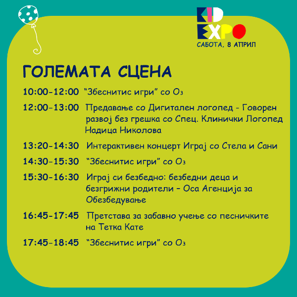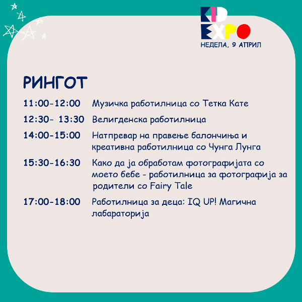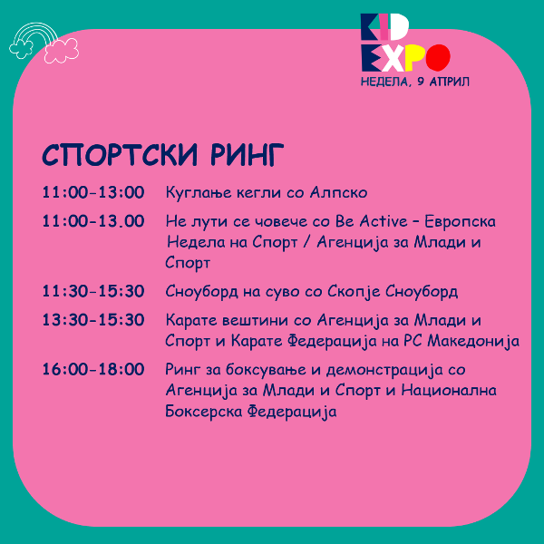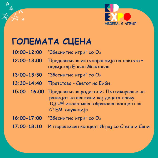 -Под еден покрив ќе понудиме изложувачи кои се внимателно одбрани и кои имаат одлични и квалитетни производи за децата, од едукација и игри, облека и додатоци, играчки, опрема и мебел, здравје и козметика, храна и пијалоци. Покрај изложбено-продажните штандови, на Кид Експо организираме и Ринг со креативни и спортски работилници, концерти и претстави на Големата сцена, едукативни и интересни предавања за родителите и децата. Она што дополнотелно самиот настан го прави поинтересен е што дел од изложувачите на производи или услуги на самите штандови ќе имаат интерактивно претставување што дополнително ќе ги направи среќни и задоволни дечњата – велат организаторите.