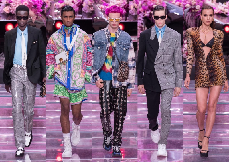 Машкит костум се враќа преку иновативни силуети, ткаенини и разиграни акценти. Некои од сакоата се во две различни ткаенини, на пример едната страна е црна, другата со ситно каро. Има креации со препознатливиот Версаче-принт со мотивот на Медуза, потоа со животински отпечаток и со тај дај шарата што повторно се врати во мода. Покрај формалните комбинации, прикажани се и комбинации со џинс и шарени маици, кои се инспирирани од 90-тите години и од британскиот бенд Prodigy. На ревијата имаше и неколку женски креации.